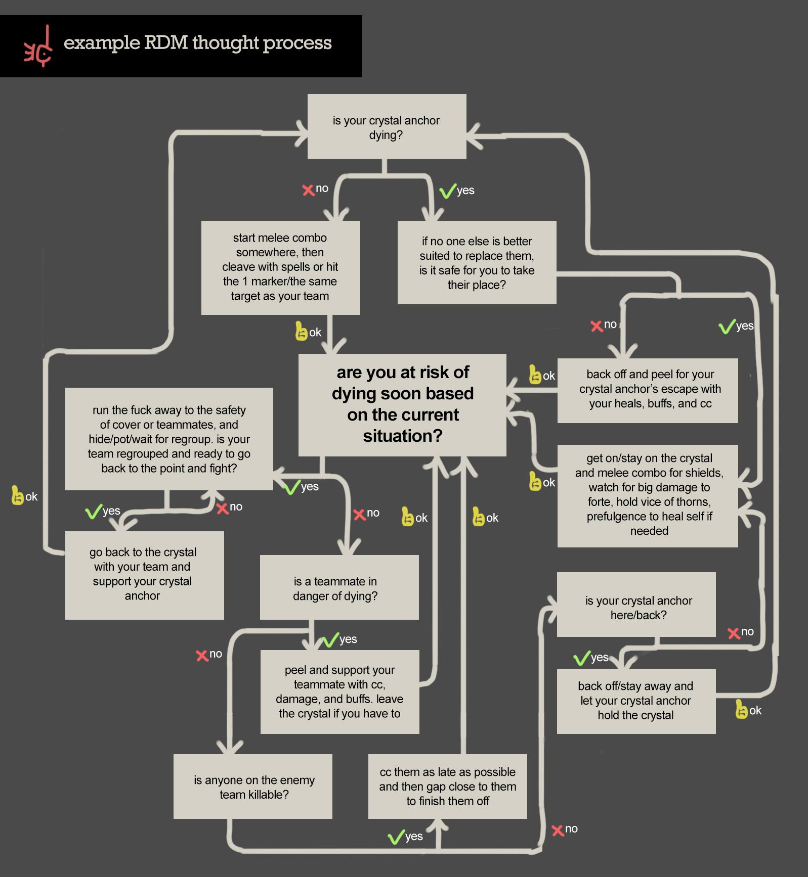 RDM is one of the jobs that can choose to risk death for cool kills and sick jukes and unusual bait to win games, but in general, dying is the worst thing you can do and sometimes, especially to those who are still learning, weighing deaths in a trade becomes muddied by cope, and fundamentals are forgotten or dismissed. I believe in limit testing, but I also believe in learning the rules before mastering how to break them and that one cannot excuse incompetence using wit and strategy. So, this writeup will explain RDM in an honest and vanilla way, and from solid foundations you can then grow personality, take gambles, and have fun.
